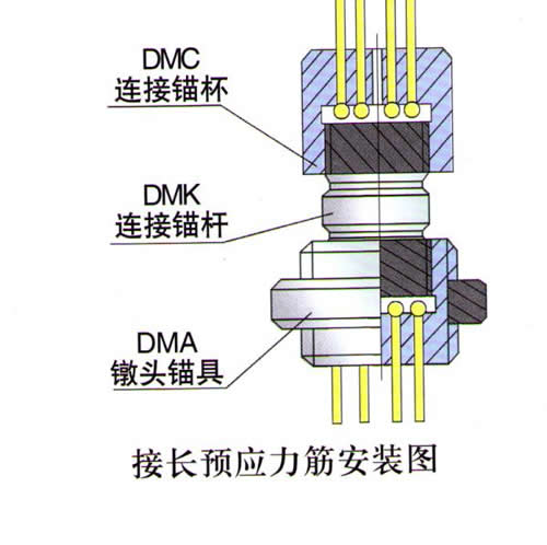 DM型墩頭錨體系包括四種錨具:A型、B型、C型、K型,可錨固標準強度為1570MPa、1670MPa的Φs5、Φs7mm高強鋼絲,用于后張法預(yù)應(yīng)力混凝土構(gòu)件中。絲墩頭成型采用LD系列墩頭器,其配套張拉機具可使用YDC系列穿心式千斤頂.